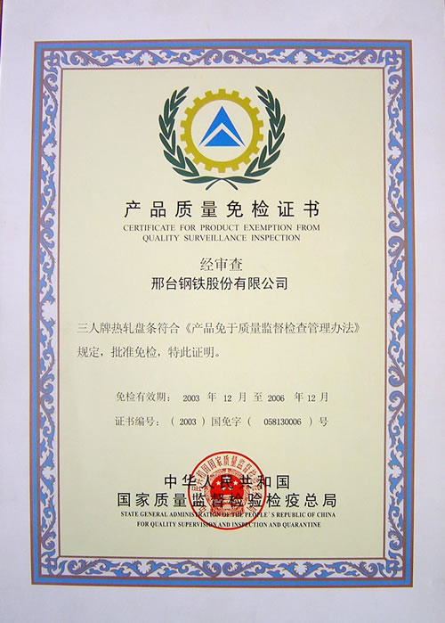 Qulity Inspection Exemption Certificate of hot rolled wire of Three Person Brand.