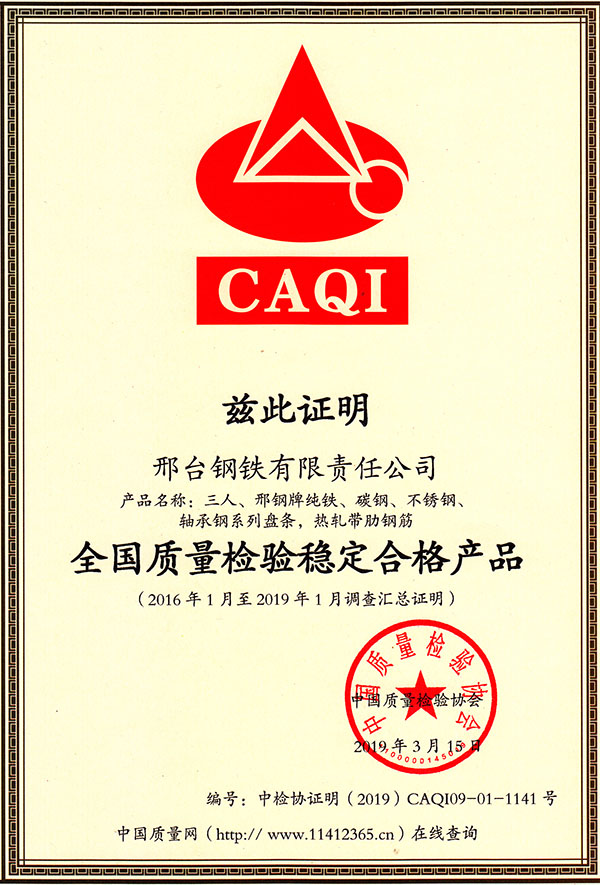 三人、邢鋼牌純鐵、碳鋼、不銹鋼、軸承鋼系列盤(pán)條,熱軋帶肋鋼筋產(chǎn)品,被評(píng)為全國(guó)質(zhì)量檢驗(yàn)穩(wěn)定合格產(chǎn)品。