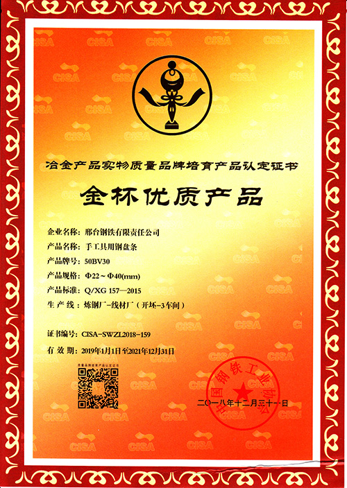 手工具用鋼盤(pán)條50BV30φ22-40mm規(guī)格,獲冶金產(chǎn)品實(shí)物質(zhì)量金杯優(yōu)質(zhì)產(chǎn)品認(rèn)定證書(shū)。