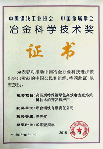 邢鋼高品質(zhì)特殊鋼綠色高效電渣重熔關(guān)鍵技術(shù)喜獲全國(guó)冶金科技一等獎(jiǎng)