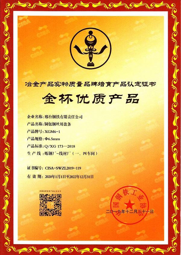 邢鋼銅包鋼絲用盤(pán)條XGM6-1 φ6.5mm規(guī)格獲冶金產(chǎn)品實(shí)物質(zhì)量金杯優(yōu)質(zhì)產(chǎn)品認(rèn)定證書(shū)