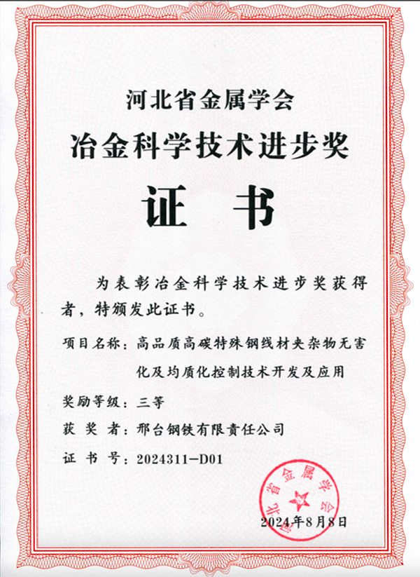 2024年公司拉拔用中高碳鋼盤條SWRH82B產(chǎn)品獲得冶金產(chǎn)品實物質量品牌培育產(chǎn)品(金杯優(yōu)質產(chǎn)品)認定證書,簡稱金杯獎。“冶金產(chǎn)品實物質量品牌培育”評選活動于24年3月啟動,由中國鋼鐵工業(yè)協(xié)會主辦,金杯獎是中國鋼鐵工業(yè)協(xié)會組織的冶金行業(yè)唯一的比較權威的獎項。