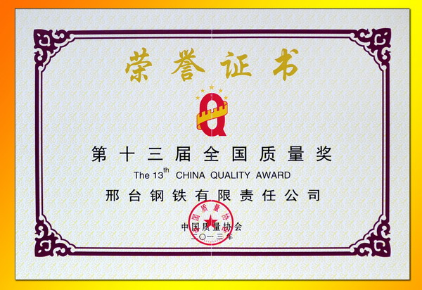 2013年11月3日,由中國(guó)質(zhì)量協(xié)會(huì)組織舉辦的第十三屆全國(guó)追求卓越大會(huì)在北京召開(kāi),會(huì)議主題是“科學(xué)發(fā)展——實(shí)現(xiàn)有質(zhì)量的增長(zhǎng)”。大會(huì)隆重舉行了全國(guó)質(zhì)量獎(jiǎng)?lì)C獎(jiǎng)儀式,邢鋼董事長(zhǎng)袁世臻、總經(jīng)理張永藏出席會(huì)議并上臺(tái)領(lǐng)取質(zhì)量管理的最高榮譽(yù)“全國(guó)質(zhì)量獎(jiǎng)”。邢鋼也同時(shí)成為本屆11家全國(guó)質(zhì)量獎(jiǎng)獲獎(jiǎng)組織中唯一一家鋼鐵企業(yè)。