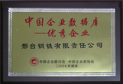 2007年12月,邢鋼榮獲由中國(guó)企業(yè)聯(lián)合會(huì)、中國(guó)企業(yè)家協(xié)會(huì)頒發(fā)的“中國(guó)企業(yè)數(shù)據(jù)庫優(yōu)秀企業(yè)”榮譽(yù)稱號(hào)。