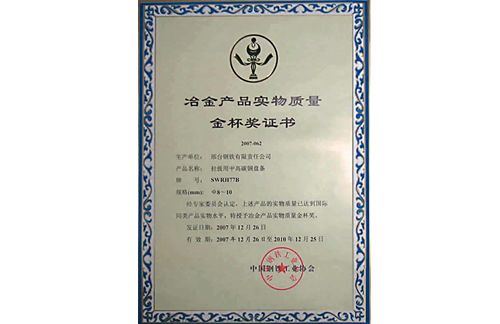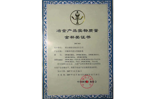2007年12月,邢鋼冷鐓和冷擠壓用鋼盤條獲冶金產(chǎn)品實(shí)物質(zhì)量金杯獎(jiǎng)。