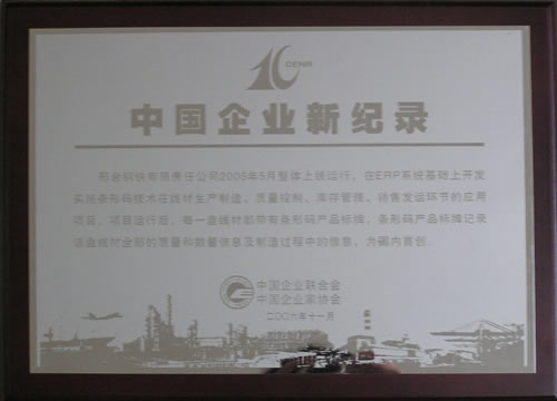 2006年11月,邢臺鋼鐵有限責(zé)任公司2005年整體上線運行,在ERP系統(tǒng)基礎(chǔ)上開發(fā)實施條行碼技術(shù)在線材生產(chǎn)制造、質(zhì)量控制、庫存管理、銷售發(fā)運環(huán)節(jié)的應(yīng)用項目,項目運行后每一條線材都帶有條型碼產(chǎn)品標(biāo)牌,條型碼產(chǎn)品標(biāo)牌記錄該盤線材全部的質(zhì)量和數(shù)量信息及制造過程中的信息,為國內(nèi)首創(chuàng)。