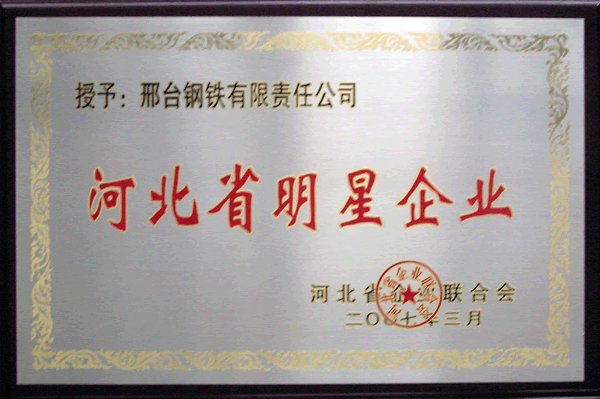2007年3月,邢鋼獲得由河北省企業(yè)聯(lián)合會頒發(fā)的“河北省明星企業(yè)”榮譽稱號。