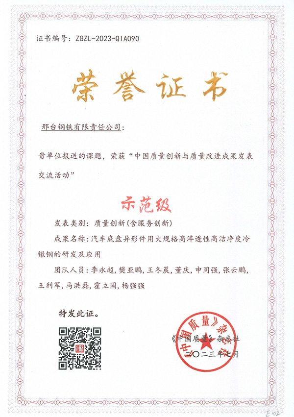 2023年7月,邢鋼《汽車底盤異形件用大規(guī)格高淬透性高潔凈度冷鐓鋼的研發(fā)及應(yīng)用》成果榮獲“2023年中國質(zhì)量創(chuàng)新與質(zhì)量改進成果發(fā)表交流活動”最高級別的“示范級”榮譽。