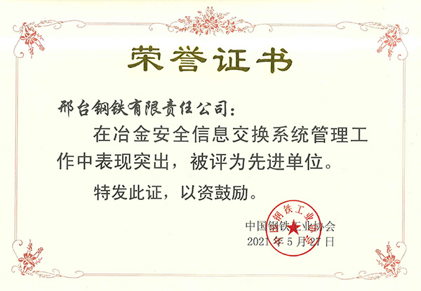 2021年5月,邢鋼在冶金安全信息交換系統(tǒng)管理工作中表現(xiàn)突出,被評(píng)為先進(jìn)單位。