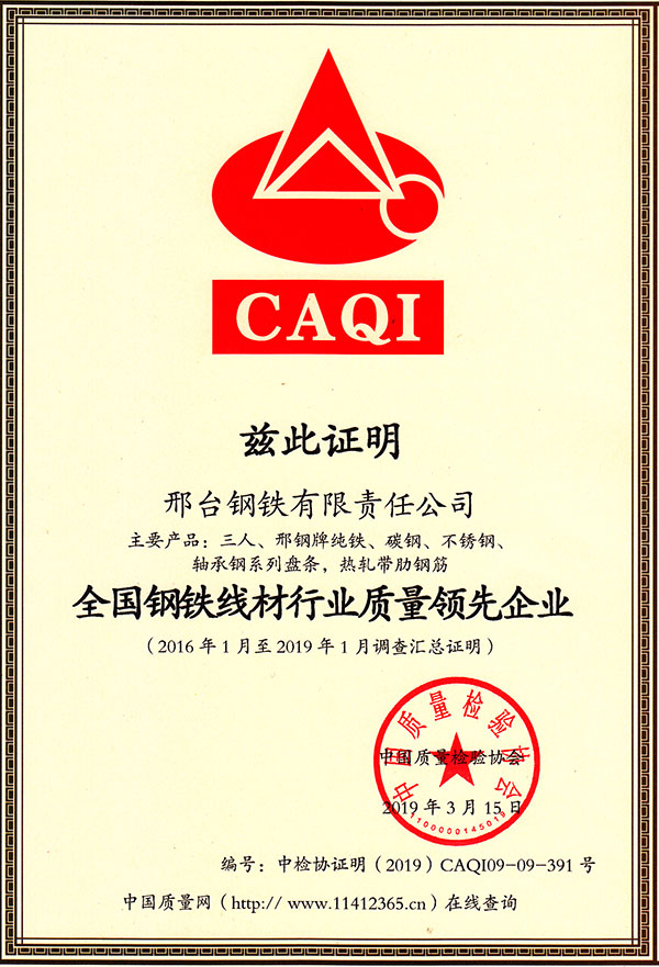 2019年3月15日,邢鋼(主要產(chǎn)品:三人、邢鋼牌純鐵、碳鋼、不銹鋼、軸承鋼系列盤條,熱軋帶肋鋼筋),被中國質(zhì)量檢驗協(xié)會授予“全國鋼鐵線材行業(yè)質(zhì)量領先企業(yè)”稱號。