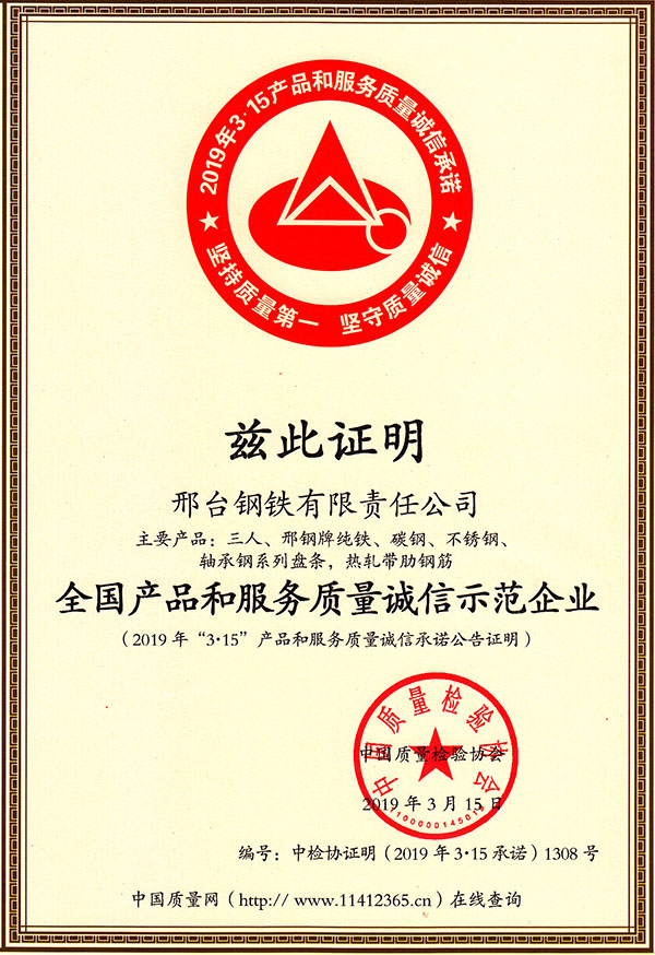 2019年3月15日,邢鋼(主要產(chǎn)品:三人、邢鋼牌純鐵、碳鋼、不銹鋼、軸承鋼系列盤條,熱軋帶肋鋼筋),被中國質(zhì)量檢驗協(xié)會授予“全國產(chǎn)品和服務質(zhì)量誠信示范企業(yè)”稱號。