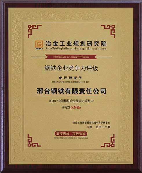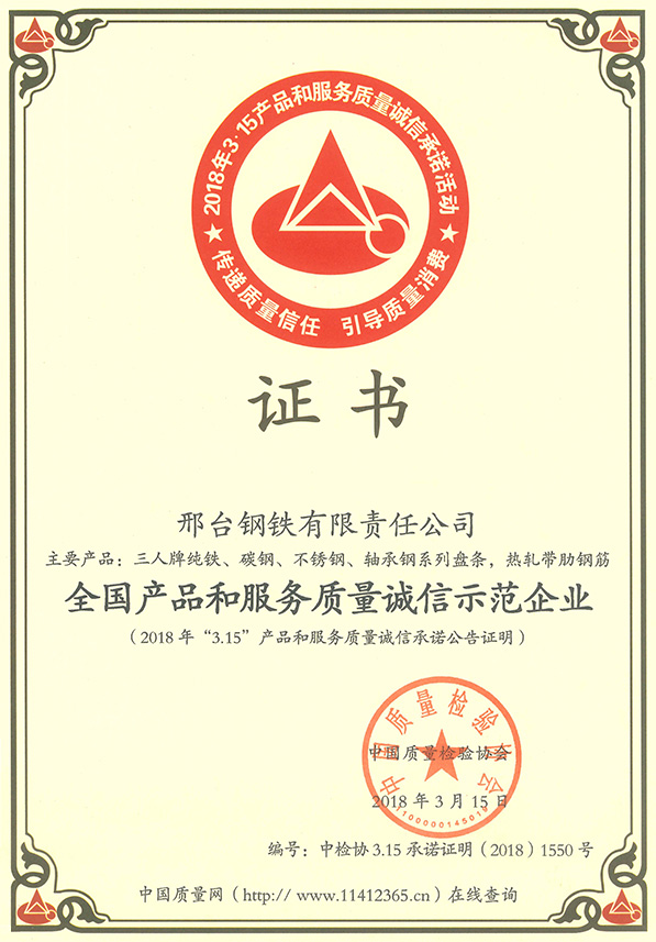 2018年3月15日,邢鋼(主要產(chǎn)品:三人牌純鐵、碳鋼、不銹鋼、軸承鋼系列盤條和熱軋帶肋鋼筋),被中國(guó)質(zhì)量檢驗(yàn)協(xié)會(huì)授予“全國(guó)產(chǎn)品和服務(wù)質(zhì)量誠(chéng)信示范企業(yè)”稱號(hào)。