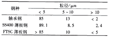 通常認(rèn)為鋼中粒徑在1-50μm的非金屬夾雜物都屬于顯微夾雜物。對于高品質(zhì)特殊用途鋼種,鋼中粒徑小于10μm的顯微夾雜物占有非常大的比例。表l為國內(nèi)幾種特殊鋼中顯微夾雜物的粒徑分布。