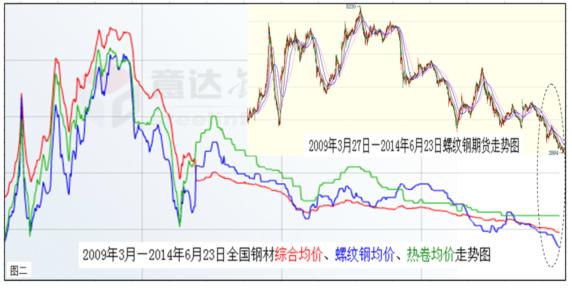 底線的提高,勢必助推中國經(jīng)濟(jì)大勢呈現(xiàn)前低后高的走勢。而經(jīng)過長期低迷的中國鋼材市場,也已經(jīng)具備逐漸走強(qiáng)的兩大要素:一是鋼市走強(qiáng)的外在環(huán)境趨好(見上圖一)。包括上半年推出一系列微刺激效應(yīng)逐漸顯現(xiàn),下半年由于經(jīng)濟(jì)增長底線提高,以及持續(xù)加推的動(dòng)力措施等合成發(fā)酵,定會(huì)形成遠(yuǎn)比上半年良好的鋼市發(fā)展環(huán)境;二是鋼市走強(qiáng)的內(nèi)在動(dòng)能充沛(下圖二)。鋼材價(jià)格經(jīng)過長期下跌后,已經(jīng)下穿了所有的技術(shù)阻力位,使業(yè)內(nèi)根本無法從技術(shù)面進(jìn)行詮釋。但從價(jià)值規(guī)律、市場規(guī)律以及基本面情況看,目前鋼材價(jià)格的底部特征已經(jīng)十分明顯,空方量能也已近衰竭。因此,經(jīng)過短時(shí)間的整固蓄勢后,震蕩上揚(yáng)應(yīng)該是后期運(yùn)行的主基調(diào)。如果再結(jié)合宏觀上經(jīng)濟(jì)增長底線的提高,下半年鋼材價(jià)格恢復(fù)性上揚(yáng)既在情理之中,也是勢所必然。所以,基于經(jīng)濟(jì)和鋼市大勢筆者作出,下半年全國鋼材價(jià)格勢必高于上半年的預(yù)測。