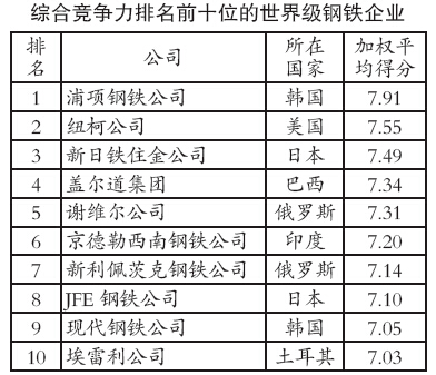 世界鋼動(dòng)態(tài)公司自2002年以來每年都會(huì)對(duì)全球鋼鐵企業(yè)在生產(chǎn)規(guī)模、產(chǎn)能擴(kuò)張、國內(nèi)市場(chǎng)議價(jià)能力、高附加值產(chǎn)品生產(chǎn)、技術(shù)創(chuàng)新能力、削減成本能力、盈利能力、資產(chǎn)負(fù)債平衡、市場(chǎng)結(jié)盟及下游業(yè)務(wù)開拓等23個(gè)方面進(jìn)行評(píng)估,并發(fā)布世界級(jí)鋼鐵企業(yè)競爭力綜合排名。