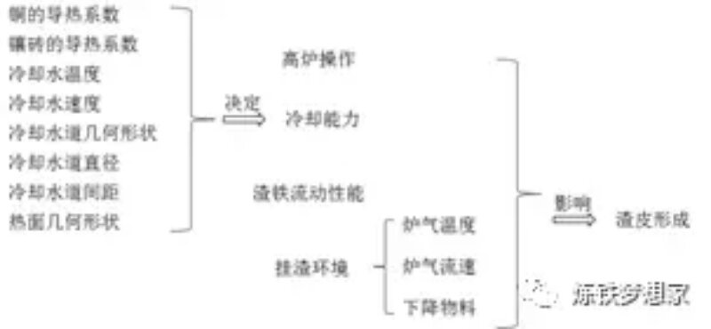 對(duì)于爐腹、爐腰及爐身下部等高熱負(fù)荷區(qū)域,無論是鑄鐵冷卻壁還是銅冷卻壁,渣皮的保護(hù)作用對(duì)冷卻系統(tǒng)的長(zhǎng)壽至關(guān)重要。冷卻壁熱面存在穩(wěn)定渣皮時(shí),塊狀帶物料、熔融渣鐵及高溫煤氣等不能直接接觸冷卻壁壁體,從而減少磨損、渣鐵侵蝕、“氫病”及有害元素等問題的發(fā)生,大幅提高冷卻壁壽命。渣皮的形成過程受多方面因素影響,如圖1所示。