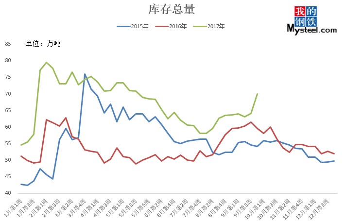 據(jù)mysteel統(tǒng)計(jì)的樣本優(yōu)特鋼廠庫(kù)存顯示,現(xiàn)全國(guó)優(yōu)特鋼廠棒材總庫(kù)存86.92萬(wàn)噸,較國(guó)慶節(jié)前增加5.67萬(wàn)噸,環(huán)比增加6.5%,較2016年國(guó)慶節(jié)后第一周庫(kù)存低0.31萬(wàn)噸,較2016年均值高9.61萬(wàn)噸,上漲12.43%。2017年內(nèi)均值為84.43萬(wàn)噸,當(dāng)前庫(kù)存較均值增加2.49萬(wàn)噸。樣本鋼廠總庫(kù)存連續(xù)7周上漲。