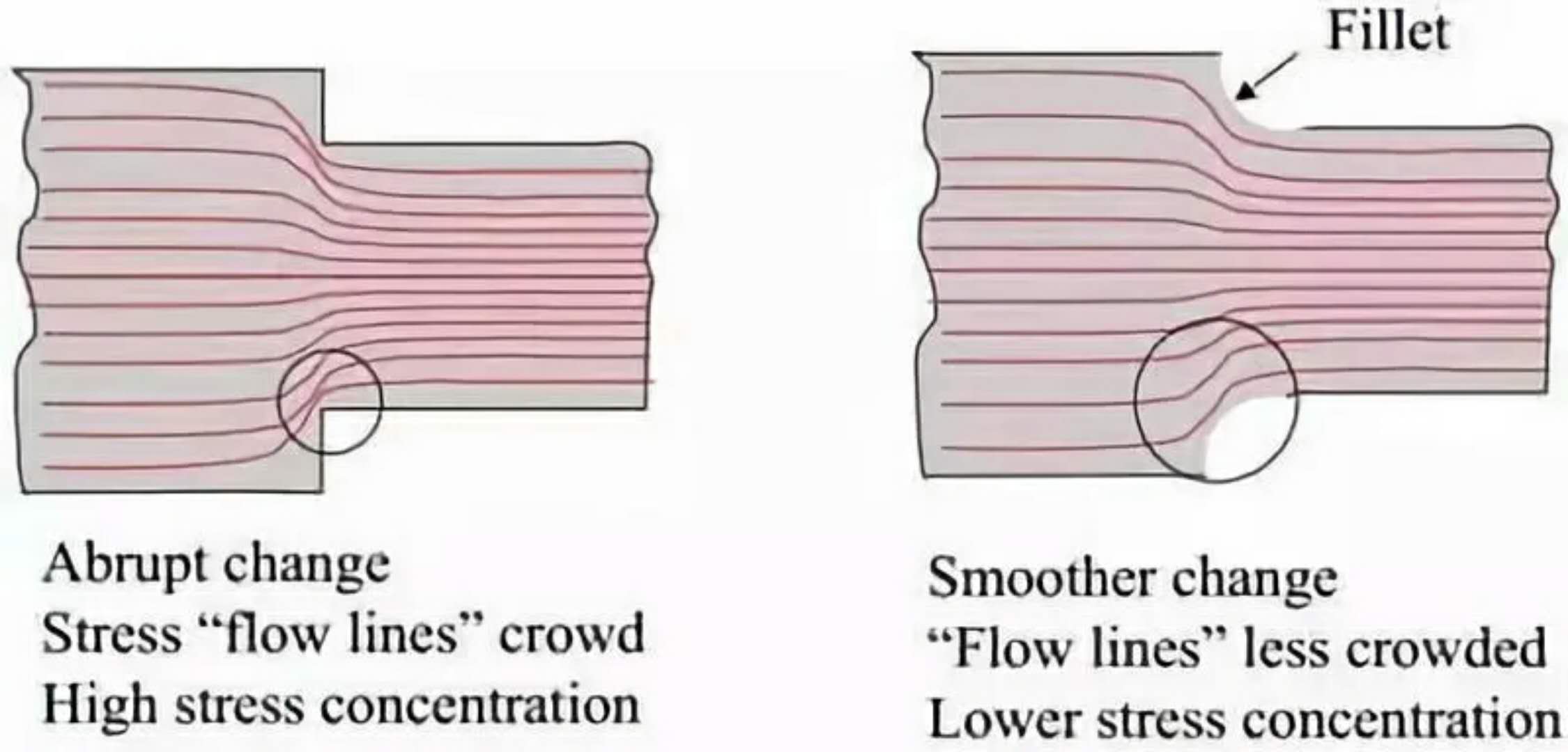 實(shí)際上,所有的疲勞失效都發(fā)生在應(yīng)力集中點(diǎn)或應(yīng)力集中處的零件的外表面上。例如,凹槽、圓角、孔、螺紋、鍵槽、花鍵、焊縫等。如果該部件提供長期無故障的服務(wù),設(shè)計(jì)者必須考慮到這些應(yīng)力提升器的影響。應(yīng)力集中的作用直接與其半徑小有關(guān)。與先前提到的促進(jìn)疲勞失效的微裂紋一樣,應(yīng)力發(fā)生位置的半徑越小,產(chǎn)生的應(yīng)力越集中越大。有趣的是,應(yīng)力集中對高延展性的金屬影響很小。其解釋是,由幾何變化引起的應(yīng)力集中被限制在屈服應(yīng)力,止于塑性變形。