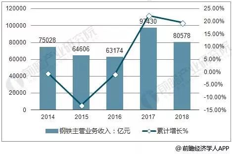 據(jù)前瞻產業(yè)研究院發(fā)布的《中國鋼鐵行業(yè)發(fā)展前景與投資戰(zhàn)略規(guī)劃分析報告》指出,2018上半年中國鋼鐵行業(yè)主營業(yè)務收入達到30525億元,累計增長15.8%。回顧2012-2017年鋼鐵行業(yè)營業(yè)收入情況:近六年來,我國鋼行業(yè)營業(yè)收入較為穩(wěn)定,2015年以來累計增長率逐漸回暖。中國鋼鐵行業(yè)將繼續(xù)保持穩(wěn)中有長趨勢,預計2018年中國鋼鐵行業(yè)營收將突破80000億元。