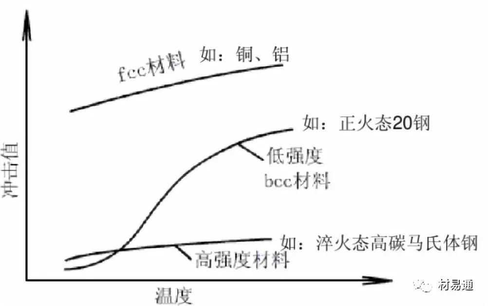 體心立方晶體金屬及合金或某些密排六方晶體金屬及其合金,特別是工程上常用的中、低強(qiáng)度結(jié)構(gòu)鋼(鐵素體-珠光體鋼),在試驗(yàn)溫度低于某一溫度tk時(shí),會(huì)由韌性狀態(tài)變?yōu)榇嘈誀顟B(tài),沖擊吸收功明顯下降,斷裂機(jī)理由微孔聚集型變?yōu)榇┚Ы饫?,斷口特征由纖維狀變?yōu)榻Y(jié)晶狀,這就是低溫脆性,又稱為冷脆。這種轉(zhuǎn)變稱為韌脆轉(zhuǎn)變。轉(zhuǎn)變溫度稱為韌脆轉(zhuǎn)變溫度,又稱為冷脆轉(zhuǎn)變溫度。