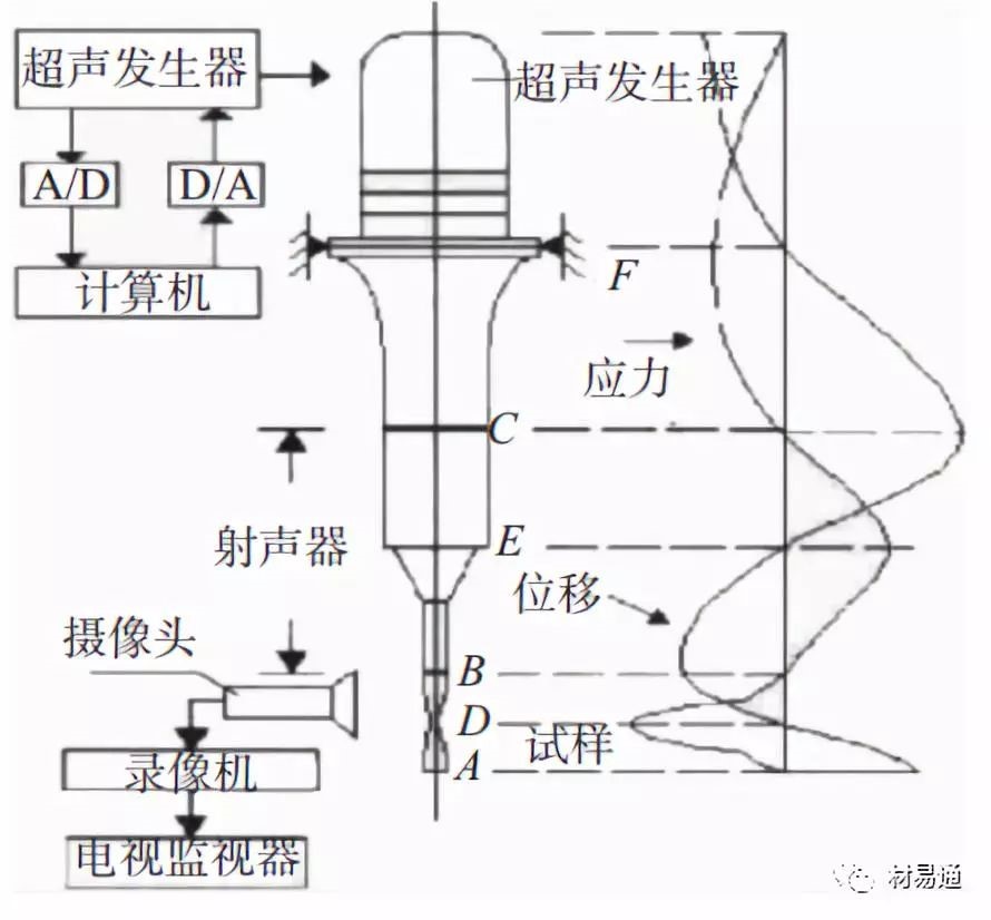 試驗裝置主要包括:(1)超聲頻率發(fā)生器(將超聲正弦波電信號由50Hz轉(zhuǎn)變?yōu)?/span>20kHz);(2)壓力陶瓷換能器(將電源提供的電信號轉(zhuǎn)化成機(jī)械振動信號);(3)位移放大器(放大位移振幅使試樣獲得所需的應(yīng)變振幅)。試驗裝置原理:由壓電陶瓷換能器、位移放大器和試樣組成的超聲疲勞試驗機(jī)構(gòu)成了一個力學(xué)振動系統(tǒng),試樣的加載是由外加信號激勵試樣發(fā)生諧振,在試樣中產(chǎn)生諧振波來實現(xiàn)。