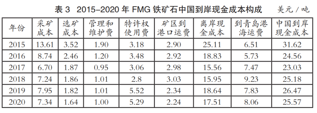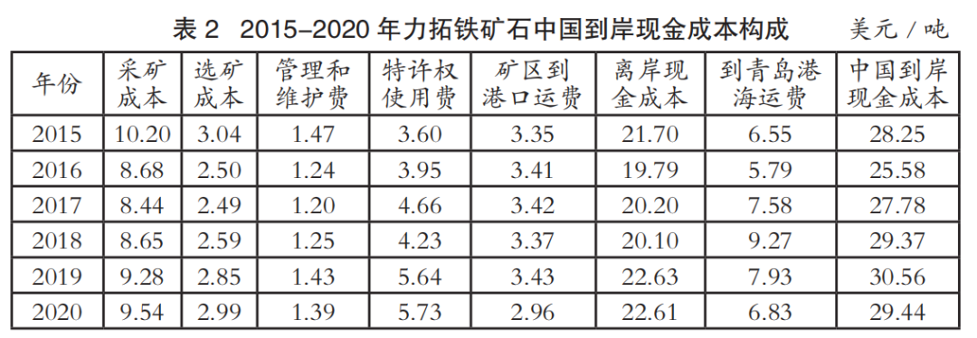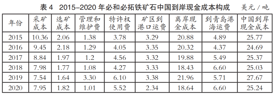 中國進口鐵礦石到岸成本主要由離岸現(xiàn)金成本和海運成本兩部分構(gòu)成。表1至表4為2015-2020年國際四大礦鐵礦石中國到岸現(xiàn)金成本構(gòu)成情況(數(shù)據(jù)來源:AME),其中離岸現(xiàn)金成本由采礦成本、選礦成本、管理和維護費、特許權(quán)使用費和礦區(qū)到港口運費構(gòu)成;中國到岸現(xiàn)金成本由離岸現(xiàn)金成本和到青島港海運費構(gòu)成;該成本數(shù)據(jù)僅為現(xiàn)金成本,不含國際四大礦的融資、折舊費用。