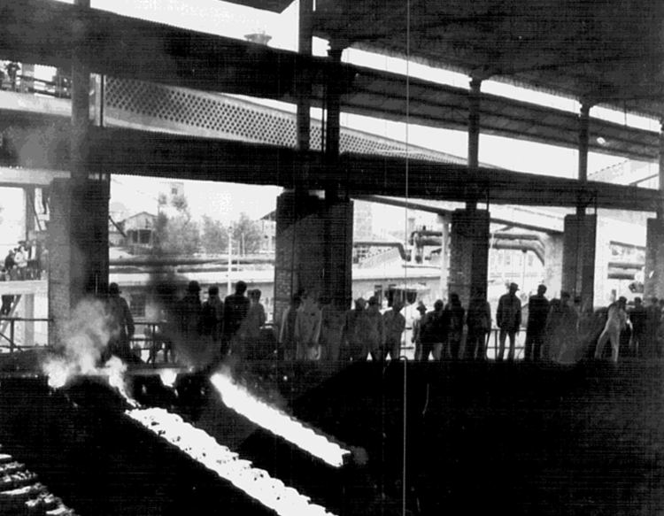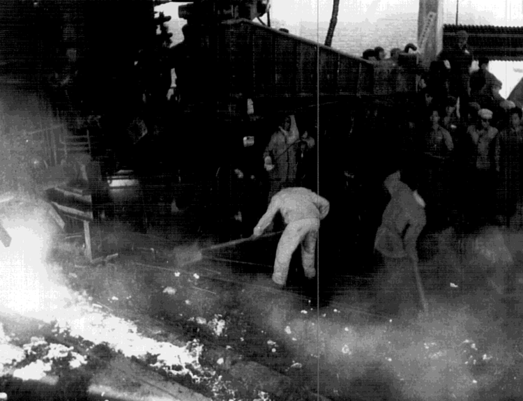 圖為1978年邢鋼鑄鐵出坯的情景,鐵塊紅火,邢鋼人為出爐的鐵水歡呼。兩年后的1980年,邢鋼10000噸低磷低硫高質量“人參鐵”的鑄造生鐵出口到日本。