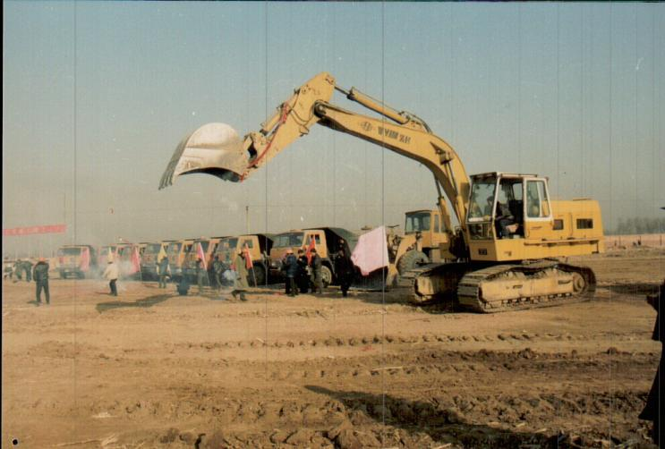 圖為1995年破土動工建設的場景,鞭炮的硝煙尚未消散,挖掘機抬起挖斗正要挖下第一鏟,運輸車整裝待發(fā),“煉鋼”來了!