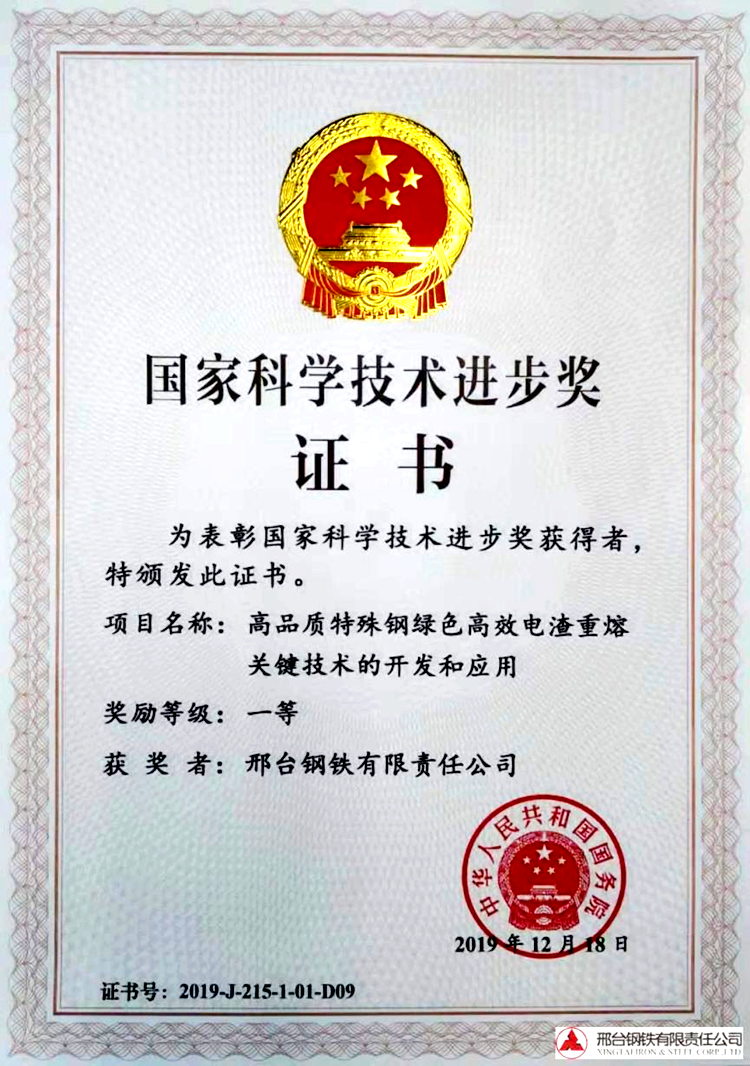 2019邢鋼“高品質特殊鋼綠色高效電渣重熔關鍵技術的開發(fā)和應用”還榮獲國家科學技術進步獎一等獎。