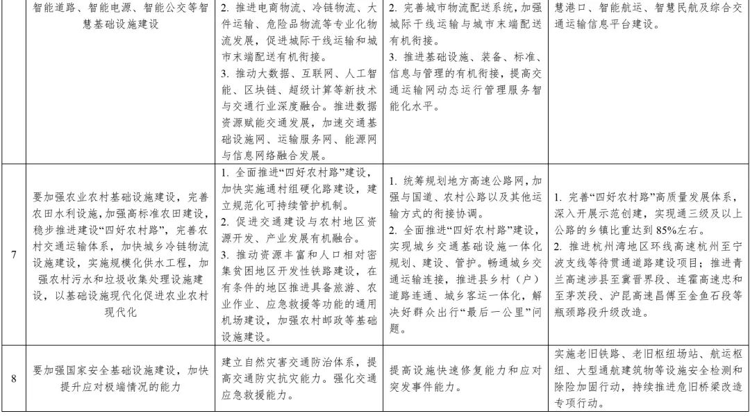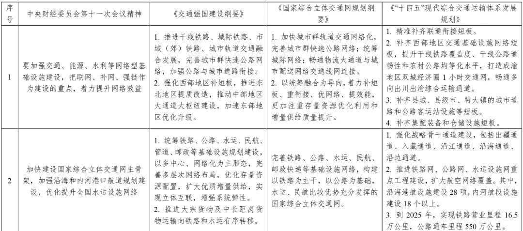 中央財(cái)經(jīng)委員會(huì)第十一次會(huì)議要求內(nèi)容與中共中央、國(guó)務(wù)院印發(fā)的《交通強(qiáng)國(guó)建設(shè)綱要》《國(guó)家綜合立體交通網(wǎng)規(guī)劃綱要》《“十四五”現(xiàn)代綜合交通運(yùn)輸體系發(fā)展規(guī)劃》等政策文件一脈相承,并有所側(cè)重,強(qiáng)化了交通、能源、水利、城鎮(zhèn)和科技等基礎(chǔ)設(shè)施在國(guó)內(nèi)國(guó)際雙循環(huán)相互促進(jìn)過(guò)程中的重要紐帶作用和產(chǎn)業(yè)鏈供應(yīng)鏈安全穩(wěn)定的保障基石作用,對(duì)構(gòu)建現(xiàn)代化基礎(chǔ)設(shè)施體系、推動(dòng)經(jīng)濟(jì)高質(zhì)量發(fā)展具有重要指導(dǎo)意義。同時(shí),兼顧了有序推進(jìn)地下綜合管廊建設(shè),加強(qiáng)城市防洪排澇、污水和垃圾收集處理體系建設(shè),加強(qiáng)防災(zāi)減災(zāi)基礎(chǔ)設(shè)施、公共衛(wèi)生應(yīng)急設(shè)施和國(guó)家安全基礎(chǔ)設(shè)施建設(shè);推進(jìn)重點(diǎn)水源、灌區(qū)、蓄滯洪區(qū)建設(shè)和現(xiàn)代化改造等內(nèi)容。表1為中央財(cái)經(jīng)委員會(huì)第十一次會(huì)議基礎(chǔ)設(shè)施建設(shè)有關(guān)內(nèi)容與相關(guān)政策文件對(duì)照。