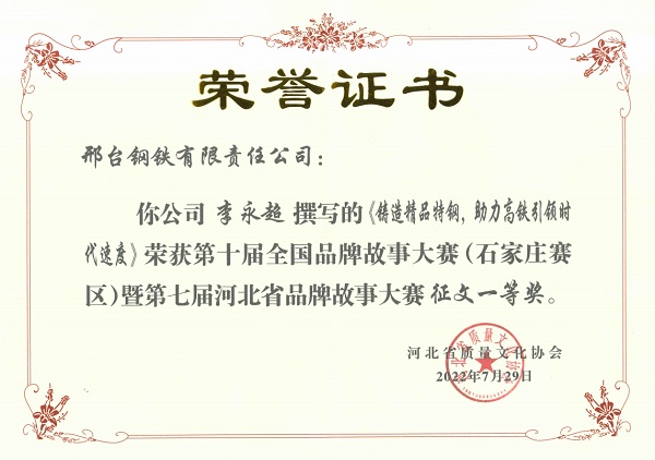 After a strict selection process, four essays, 2 micro films, a speech and a shrot video won the prize. Xingtai Steel won the "Best Organization Award in National 7th Brand Story Compitition (Hebei Division)" . the essay “Cast high-quality special steel to help high-speed rail lead the speed of the times” won the first prize; the essays “my child” “ Dream-chasers in new era” and “Lean Xingtai Steel, dream set sail” won the third prize. The micro film “measureman one day” won the second prize and “Creating a green coking plant” won the third prize. The speech called “Cast high-quality special steel to help the development of high-speed rail ” won the second prize in speech competition. What’s more, Xingtai Steel won the "Best Organization Award in National 10th Brand Story Compitition (Hebei Division)" . Zhang Yunpeng won the title of “Excellent promoter”.