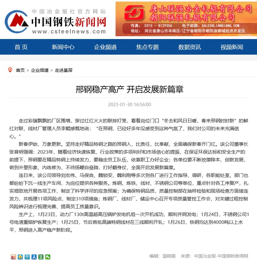 生產(chǎn)上,1月23日,動力廠130t高溫超高壓鍋爐發(fā)電機組一次開機成功,順利并網(wǎng)發(fā)電;1月24日,不銹鋼公司1號電渣重熔爐恢復(fù)生產(chǎn);1月25日,節(jié)后首批高端特鋼線材在三線順利開軋;1月26日,鐵鋼均達到4000噸以上水平,邢鋼進入高產(chǎn)穩(wěn)產(chǎn)新階段。
